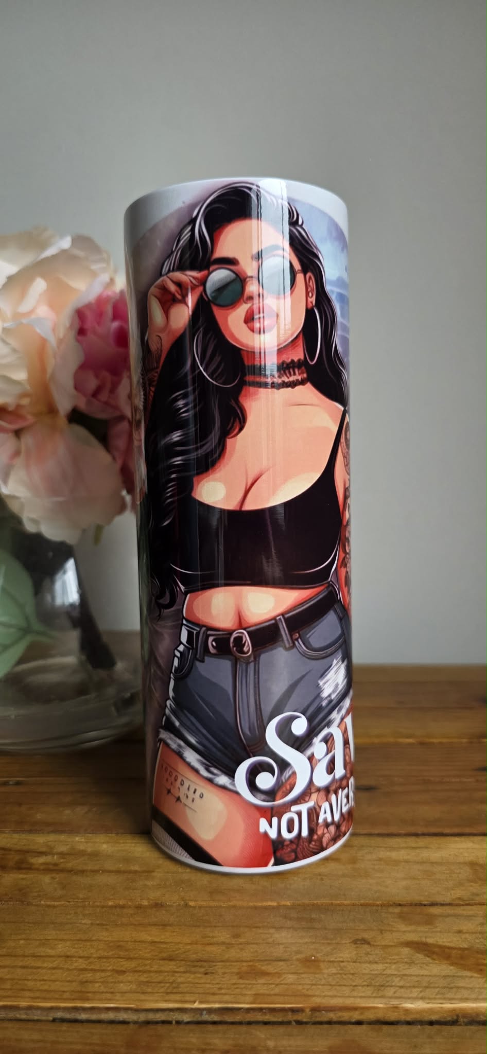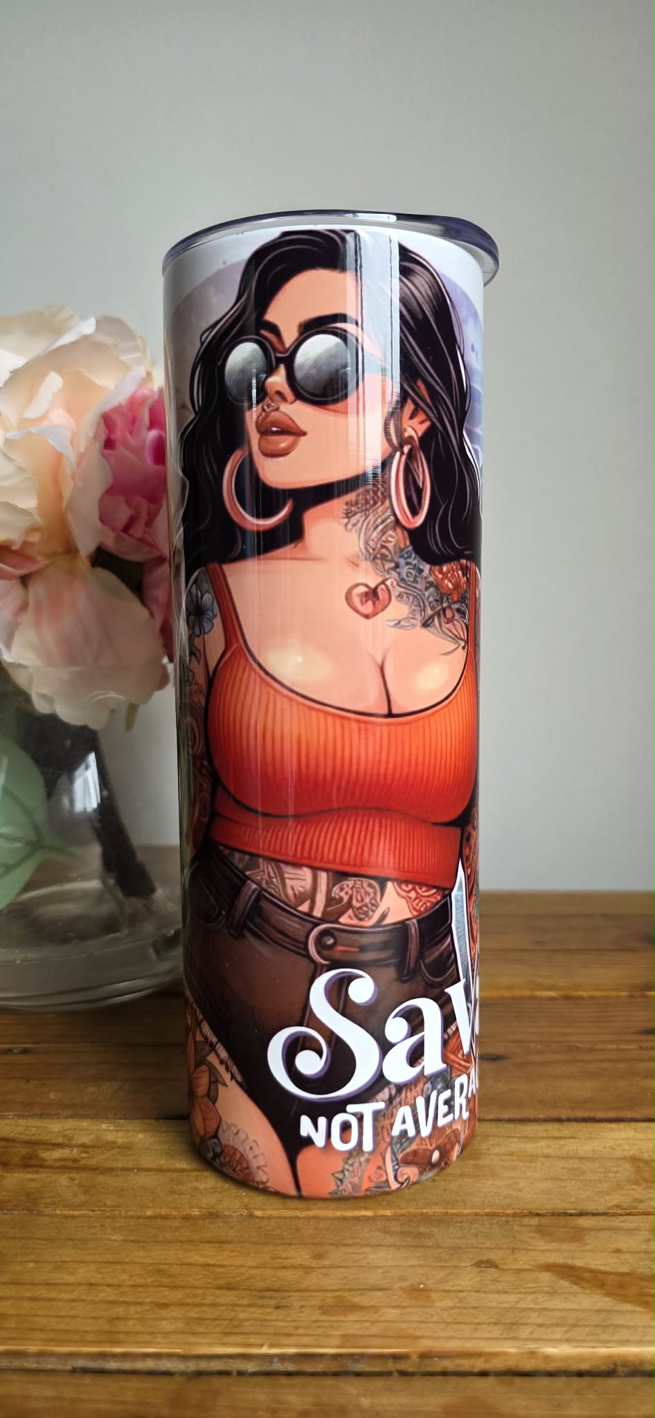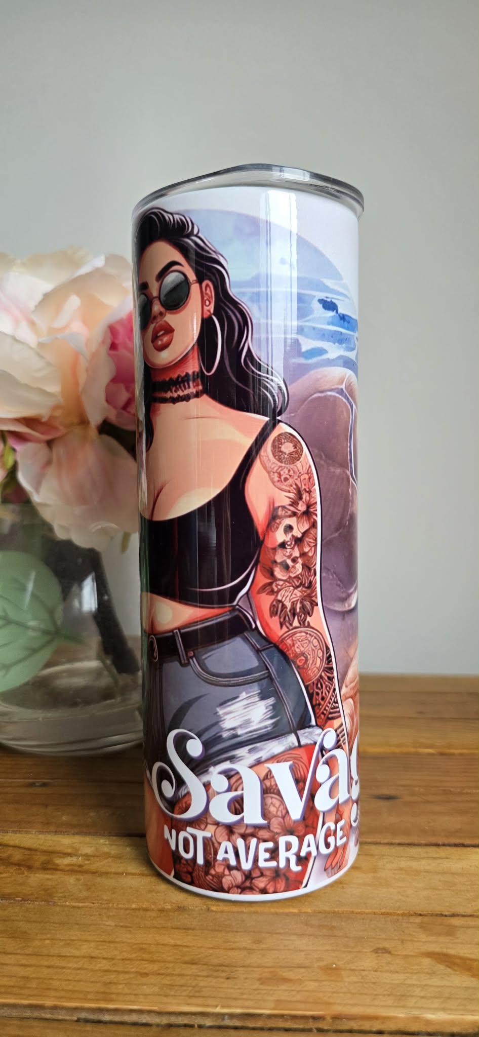These eye-catching tumblers features a confident island-inspired design with soft tropical tones, tribal patterns, and a fierce “Savage Not Average” statement. Finished with a stylish illustrated character, these tumblers bring attitude, culture, and personality to your everyday drink.